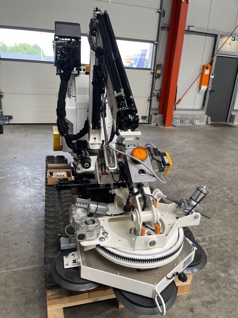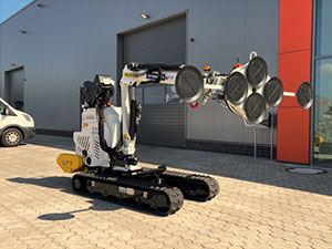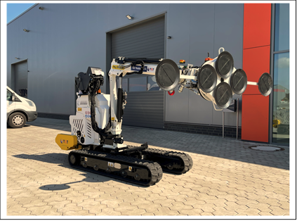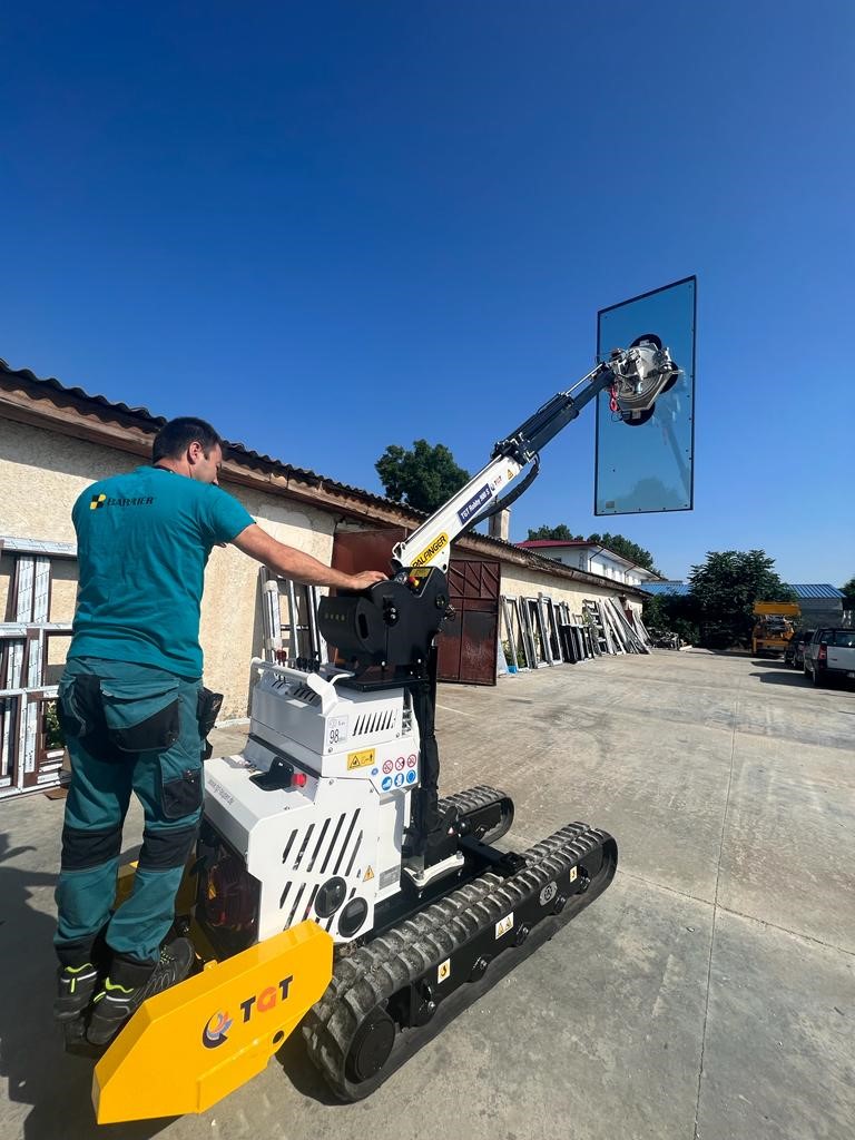 - Utilaj de ridicat-manipulat ROBBY 900 S pe sine, la care se poate atasa manipulator cu ventuzor electric cu portanta de 450- kg, care invarte, rabateaza, prinde geamurile, cu telecomanda